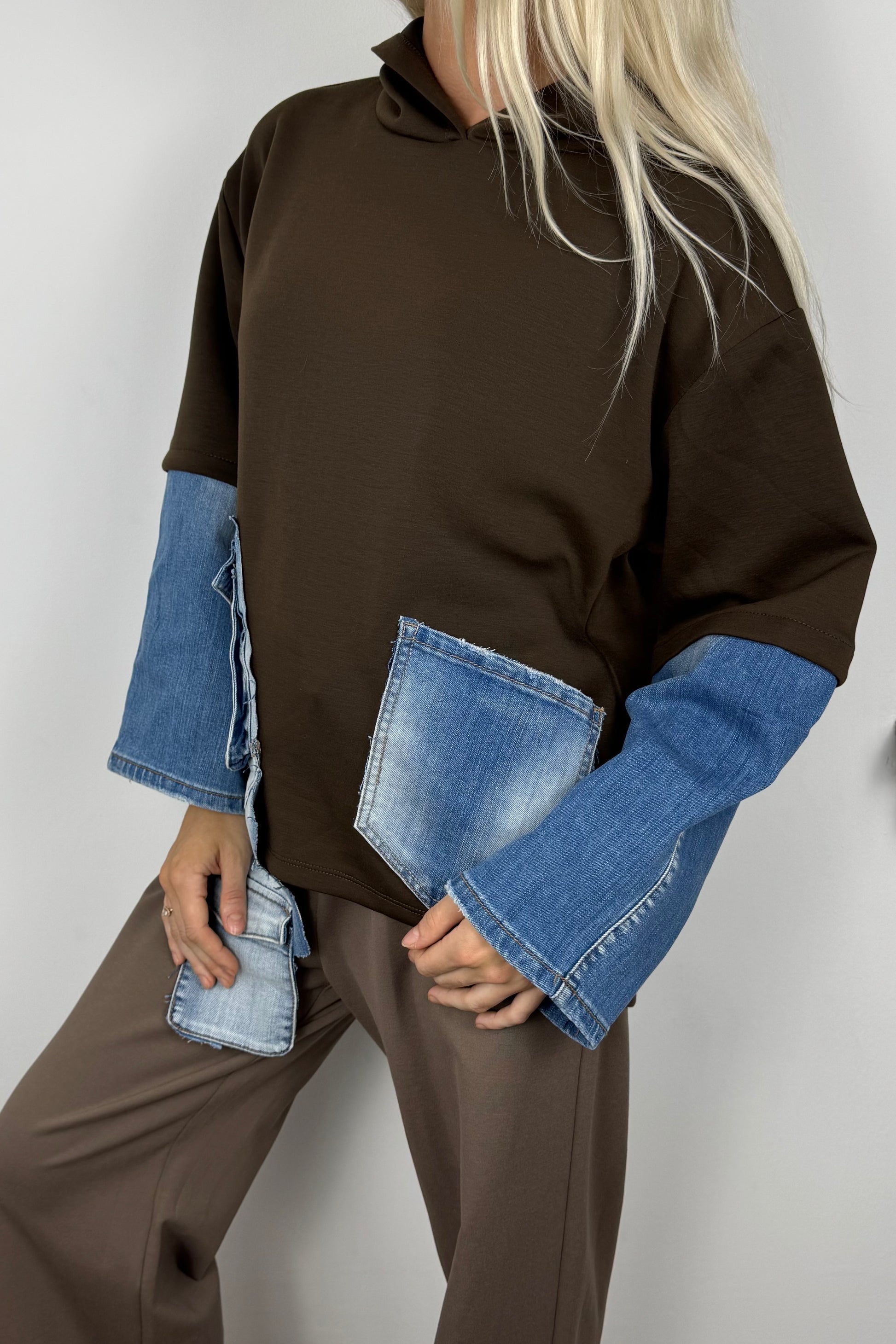 Trendiger Damen-Pullover mit Jeans-Details-Choco