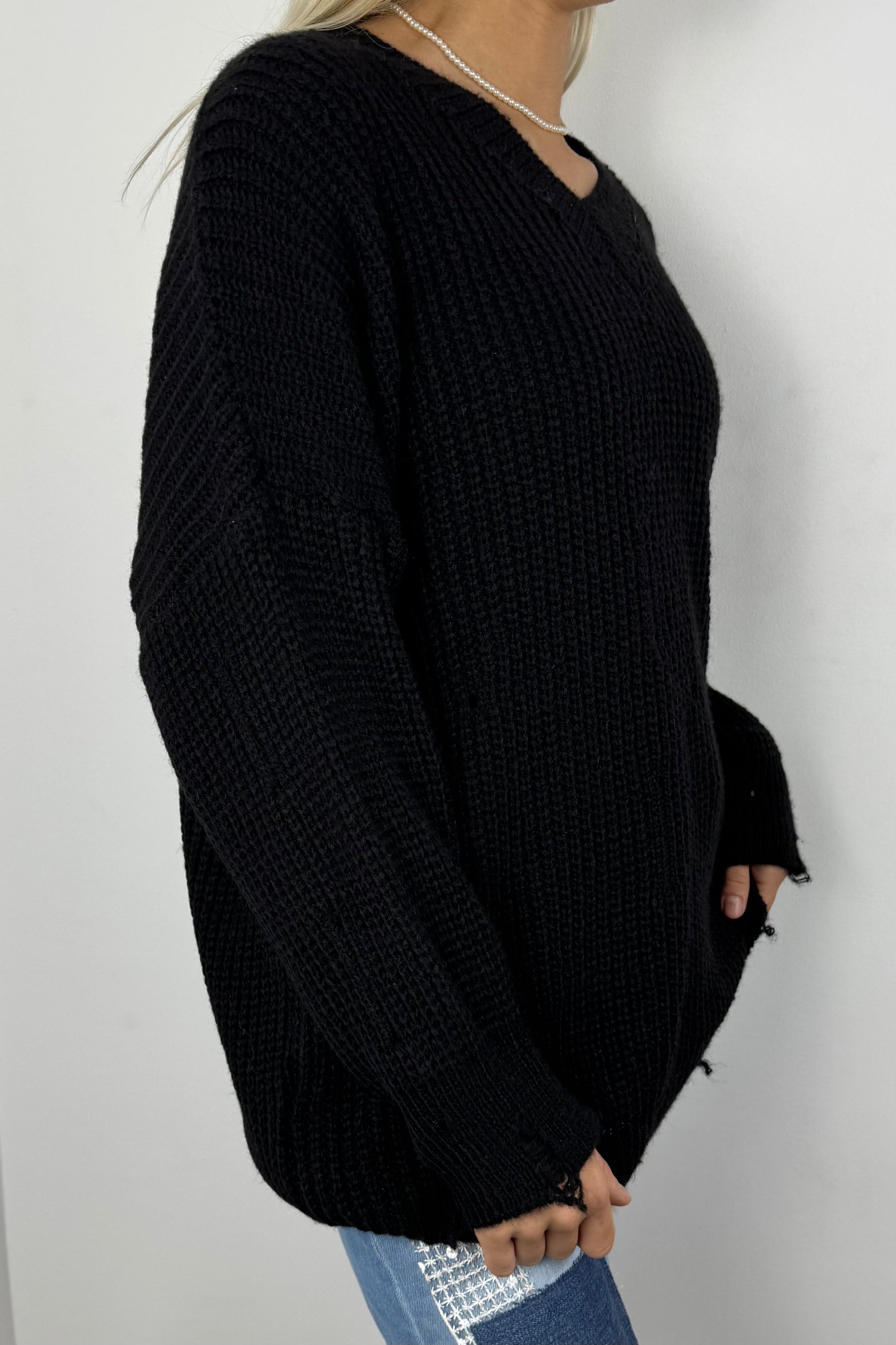Oversize Strickpullover mit V-Ausschnitt – Schwarz