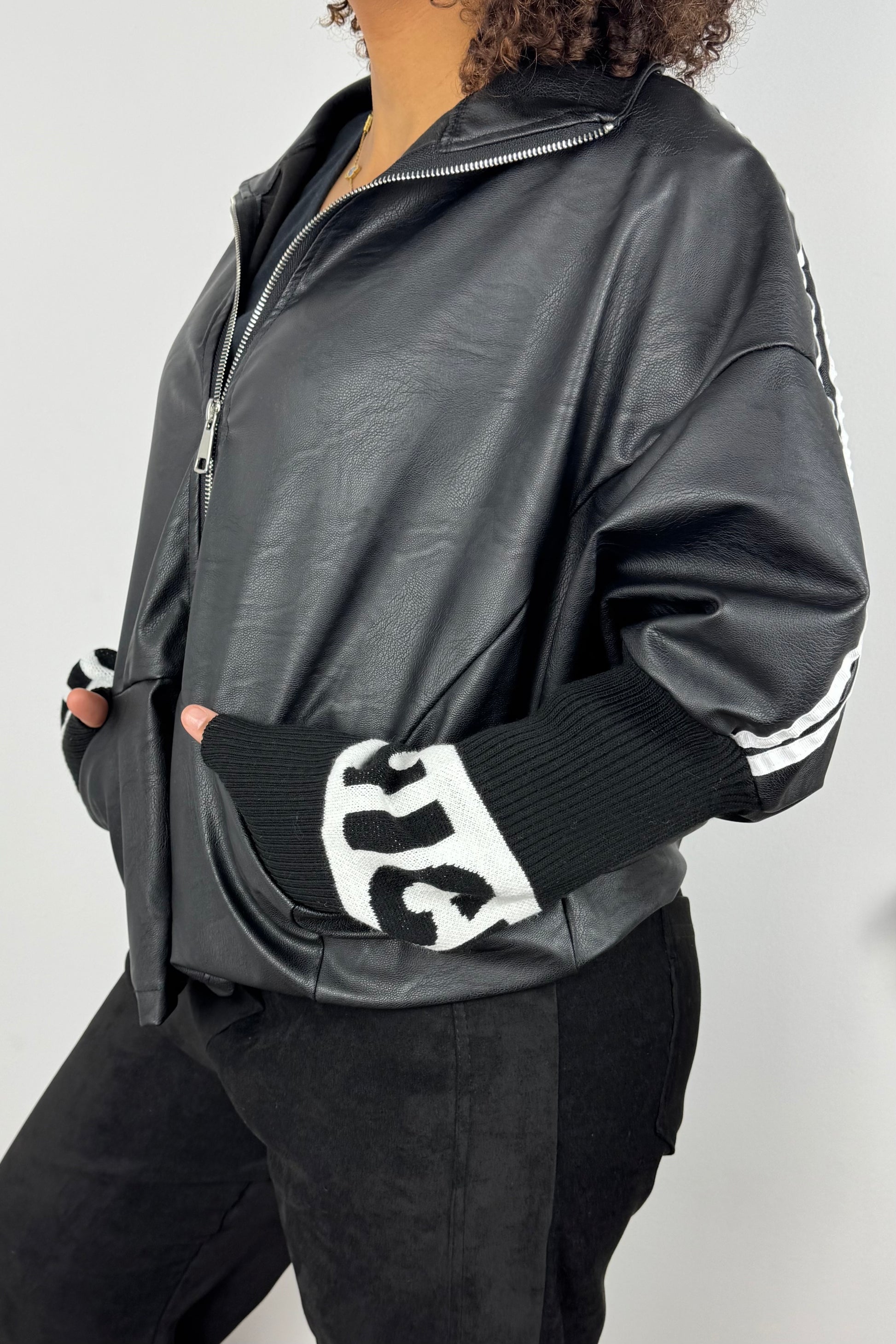 Oversize-Zipper-Jacke mit Strickärmeln – Schwarz