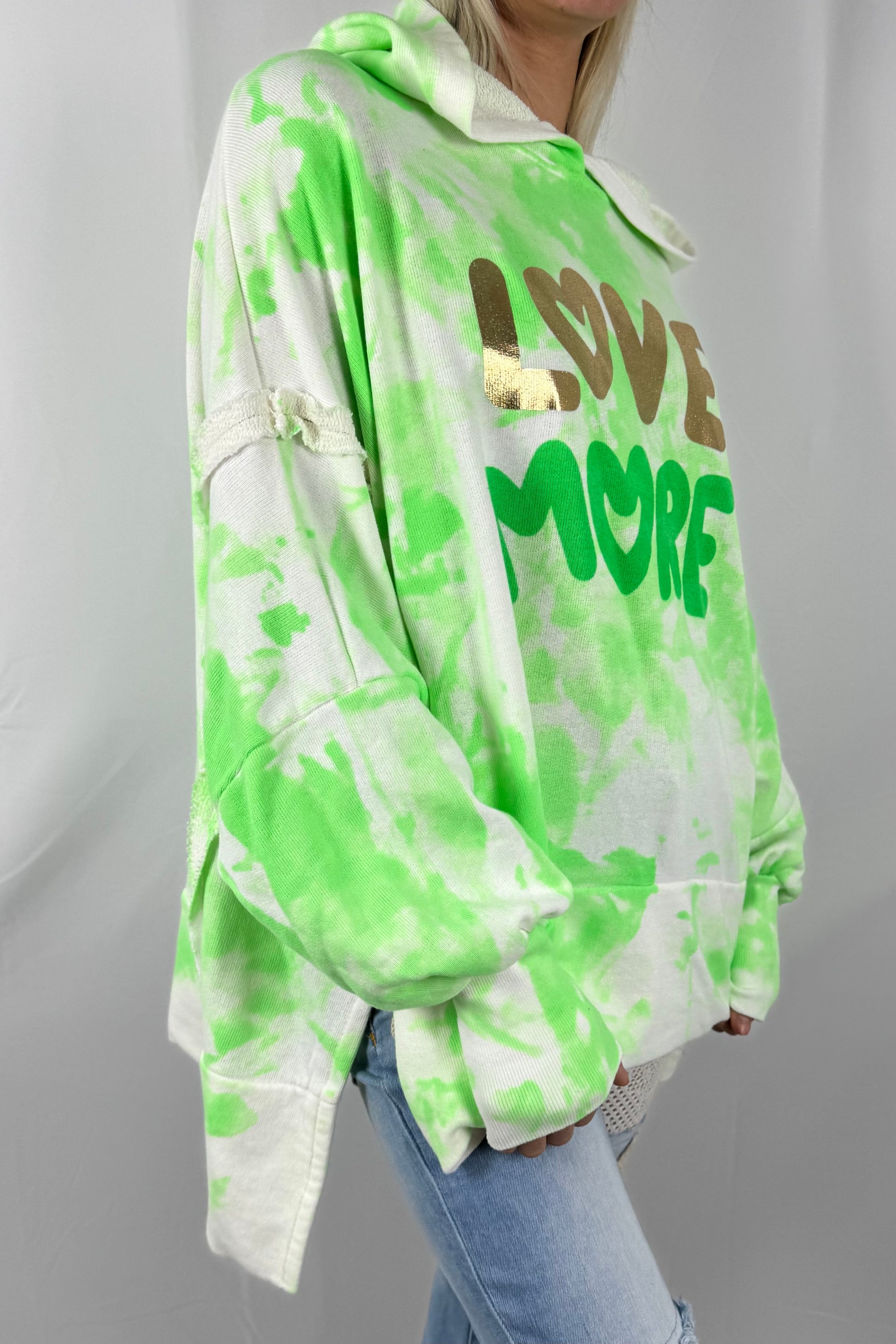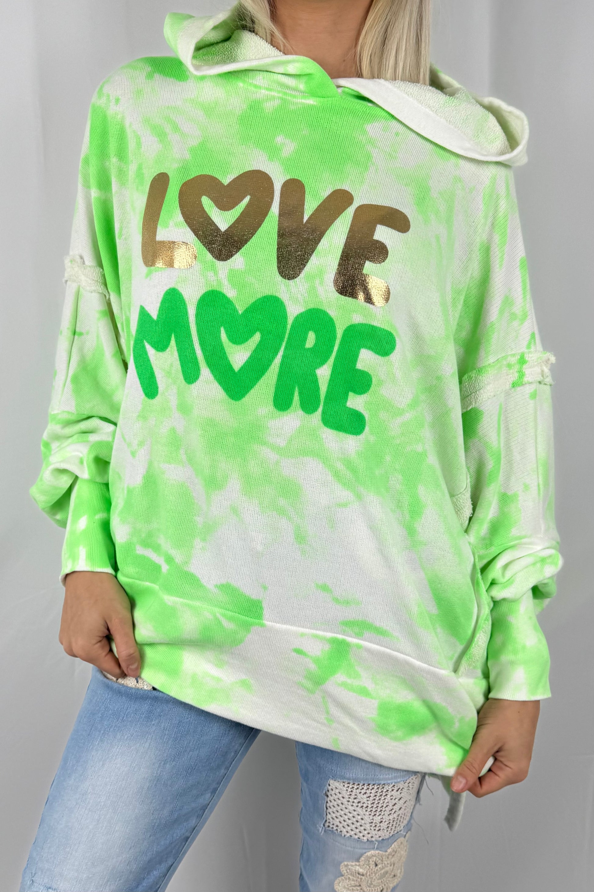 Lässiger Oversize Pullover mit „Love More“-Print in Gold und Pink. Modernes Batik-Design, weich und angenehm zu tragen – perfekt für Alltag und Freizeit.