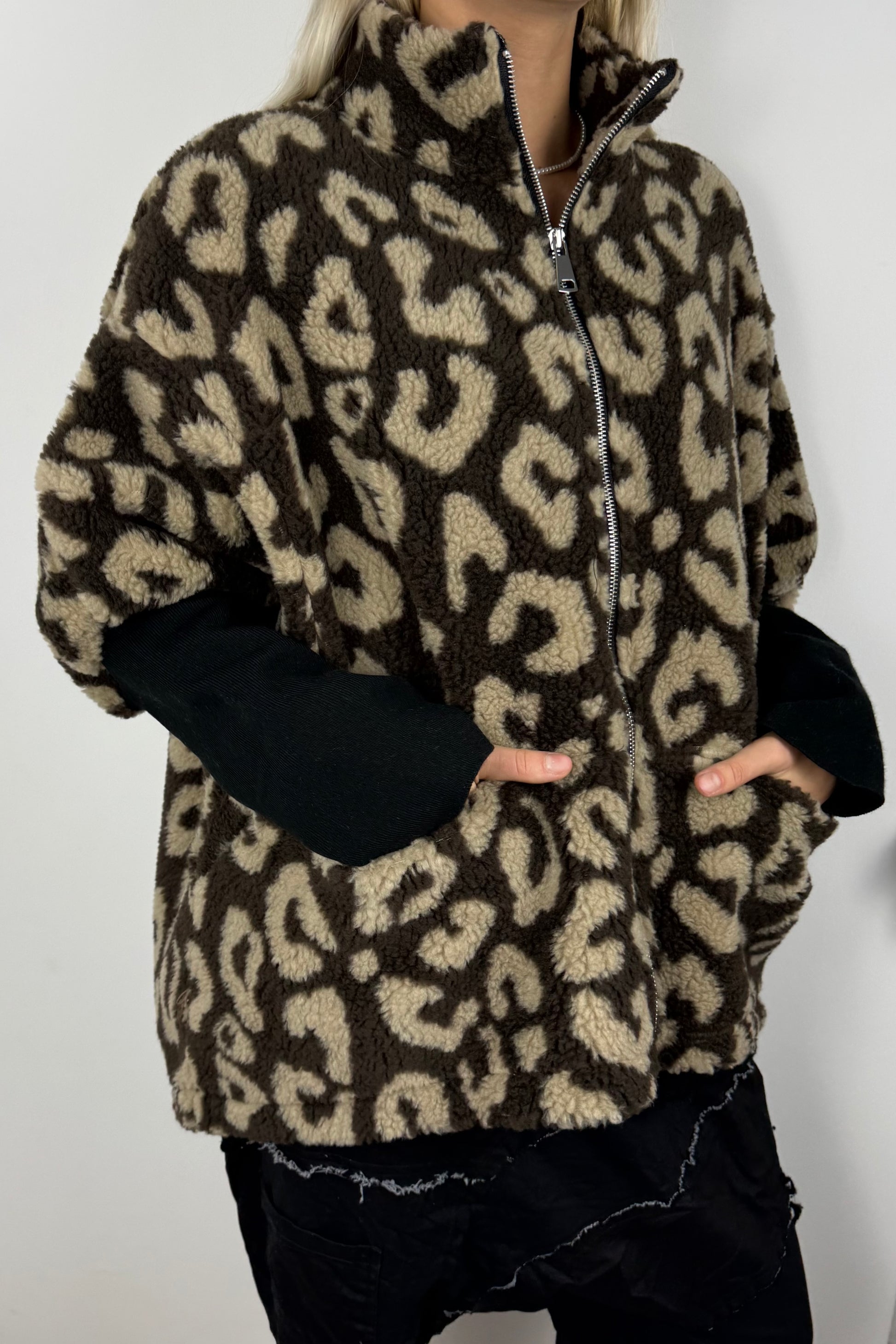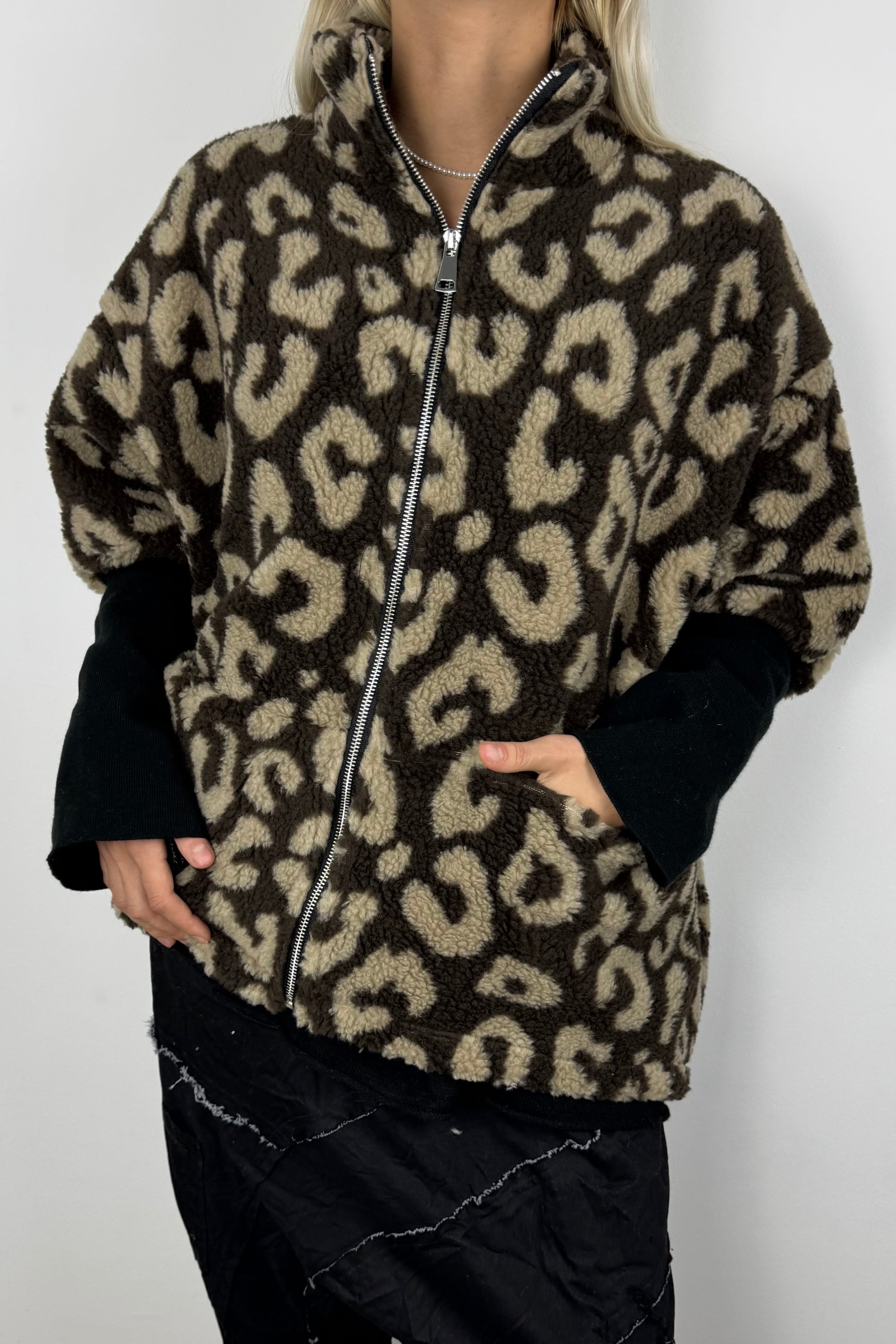 Kuschelige Oversize Teddy-Jacke mit modernem Muster und entspannter Passform. Weite Ärmel mit bequemen Bündchen, hoher Kragen und praktischer Reißverschluss sorgen für maximalen Komfort im Alltag.