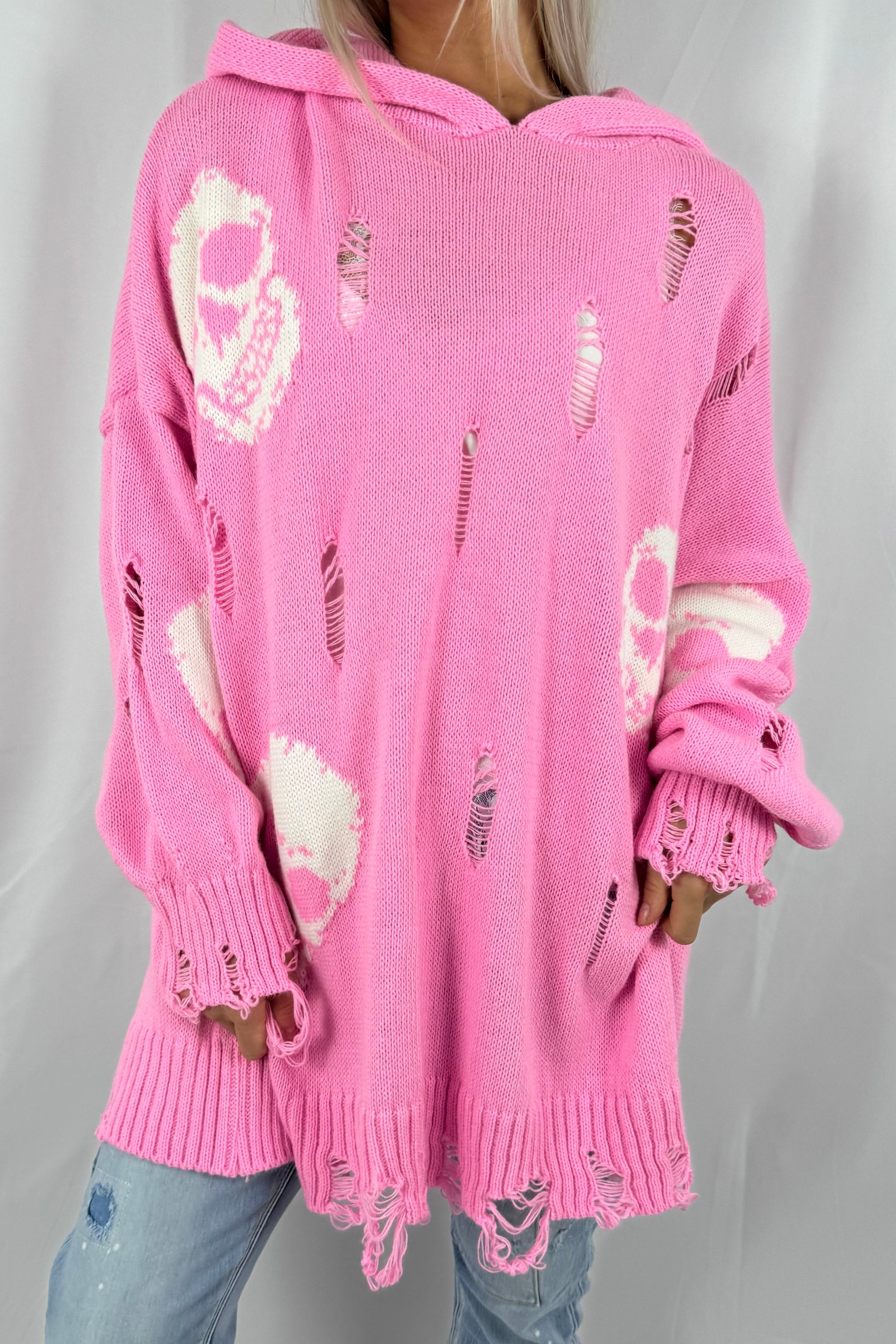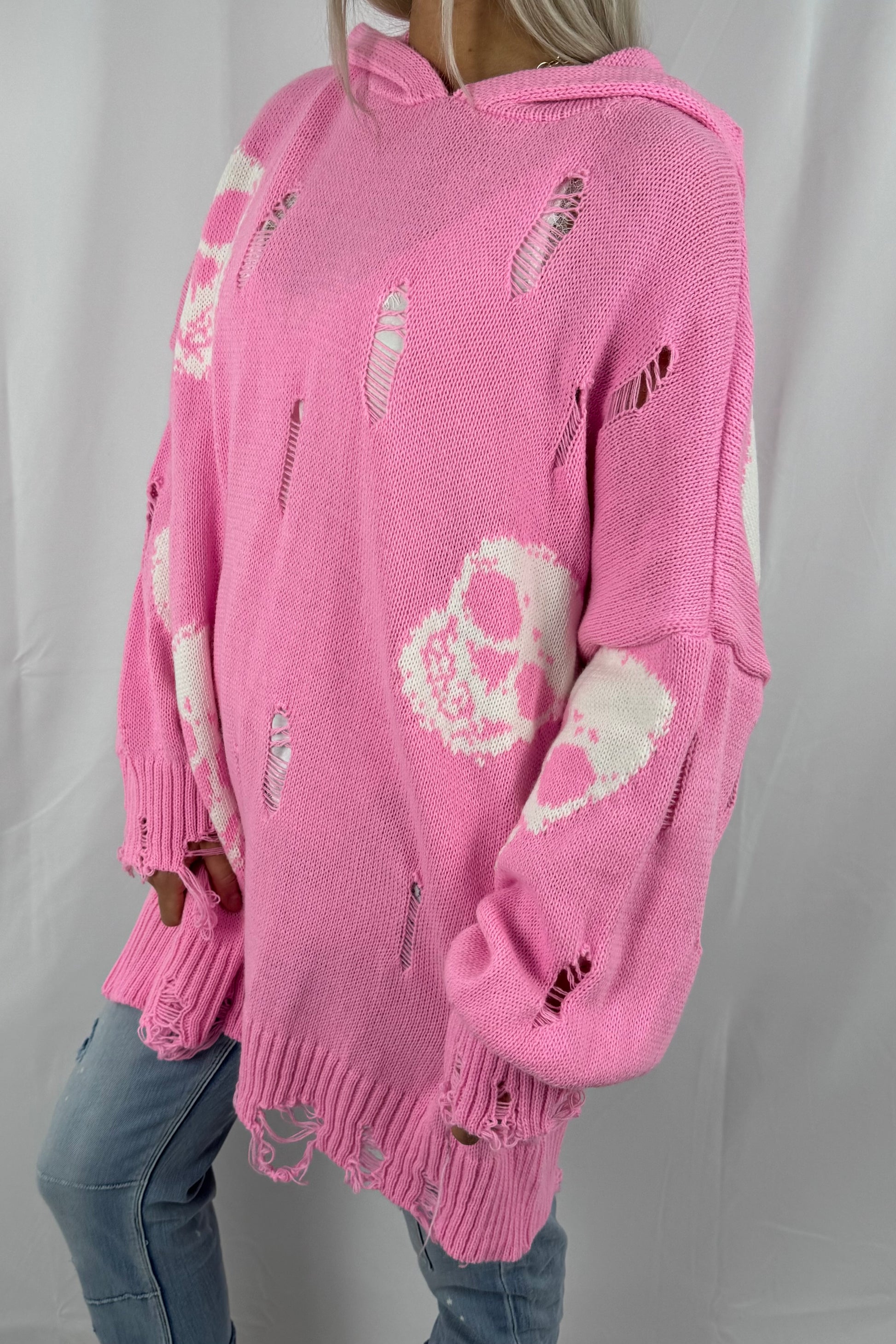Dieser Strickpullover hat einen auffälligen Totenkopf-Print (Skull-Motiv) und einen angesagten Used-Look mit dekorativen Rissen. Die lockere Passform und die Kapuze sorgen für einen lässigen, modernen Stil und hohen Tragekomfort. Ideal für Alltag und Freizeit.