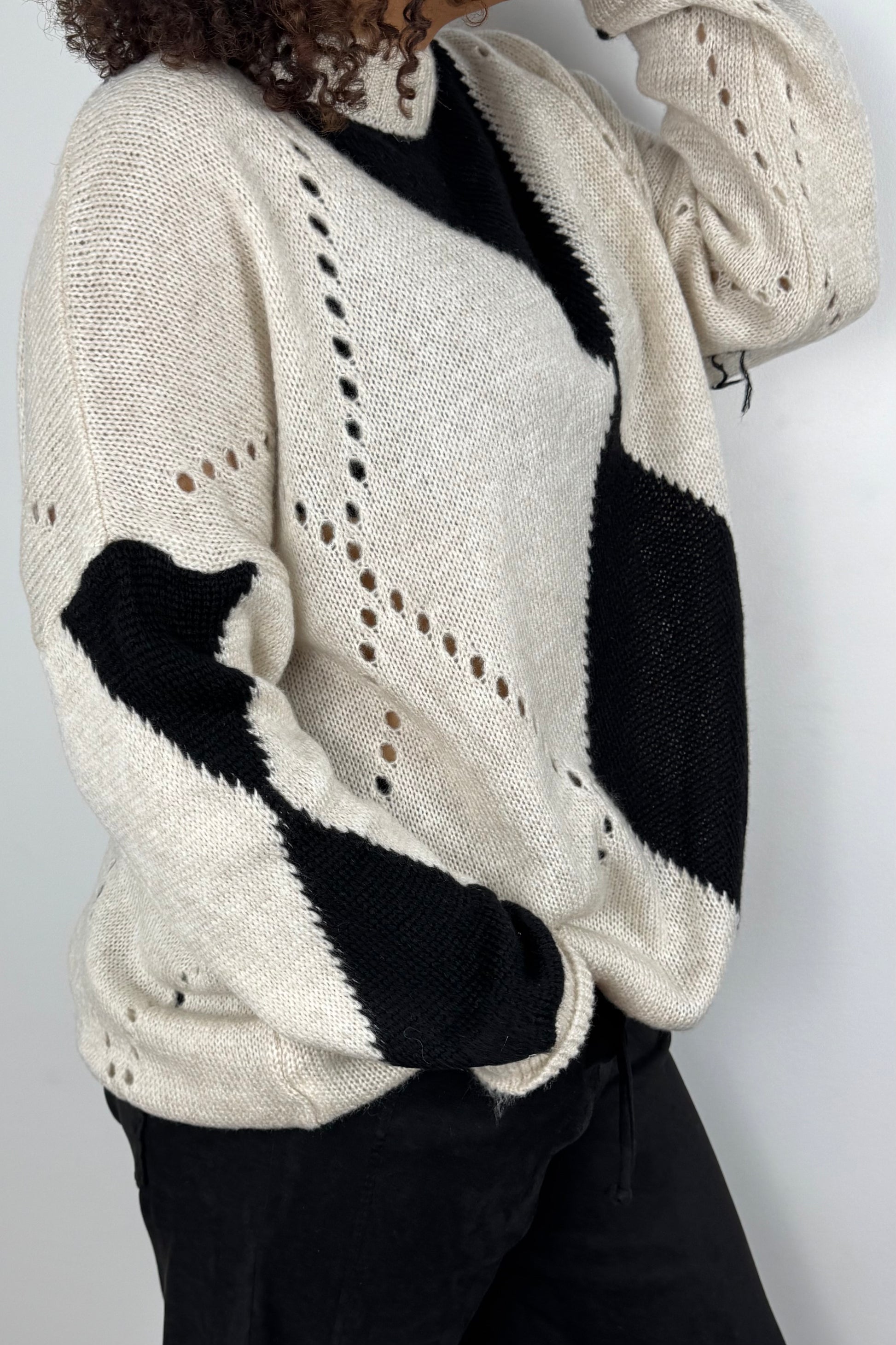 Moderner Strickpullover mit auffälligem Rautenmuster und dekorativen Lochstrickdetails. Der weiche Stoffmix und der lockere Schnitt sorgen für hohen Tragekomfort und einen stilvollen Look. Ideal für Alltag, Büro oder Freizeit.